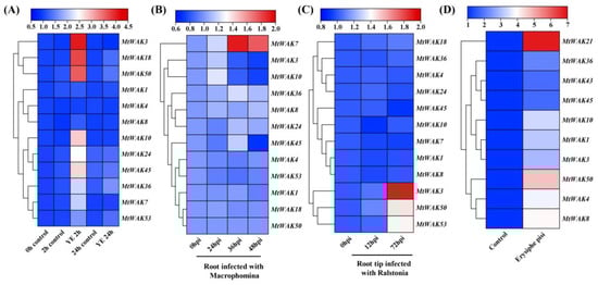 Clustered heatmap of the relative expression levels of MtWAK-RLKs involved in biotic stress response. (A) Yeast eliciter (YE) treatment. (B) Macrophomina infection. (C) Ralstonia infection. (D) Erysiphe pisi infection. The relative gene expression levels after treatments were calculated and compared with the untreated control or before treatment. The clustered heatmap on log2 scale was drawn using TBtools software (Version 1.108).