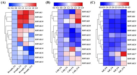 Clustered heatmap of the relative expression levels of MtWAK-RLKs involved in abiotic stress response. (A) Drought stress. (B). Cold stress (C) Salt stress. The relative gene expression levels after treatments were calculated and compared with the control untreated or before treatment. The clustered heatmap on log2 scale was drawn using TBtools software (Version 1.108).
