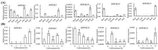 Expression analysis of selected MtWAK-RLK genes in different tissues and under cold stress using qRT-PCR. (A) Different tissues. (B) Cold stress. The error bars were obtained from three measurements. nd indicates not detected. Significant differences are indicated as different lowercase letters (P ≤ 0.05, by one-way ANOVA).