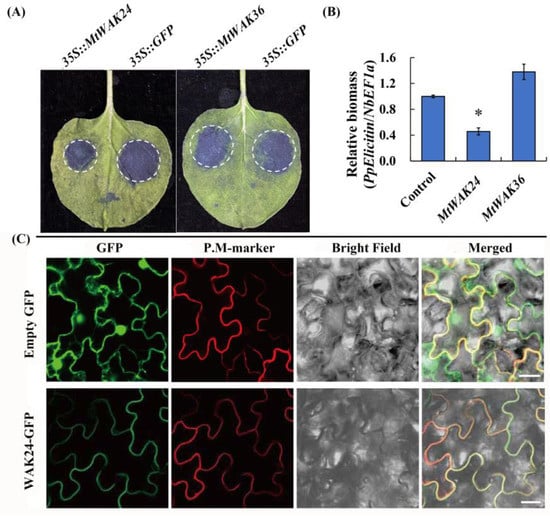 Plasma membrane localized MtWAK24 inhibited Phytophthora infection in tobacco. N. benthamiana leaves individually expressing 35S::MtWAK36, 35S::MtWAK24 or 35S::GFP were inoculated with P. parasitica mycelial plugs at 24 h after Agrobacterium infiltration. At 48 hpi, infected leaves were stained using Evans blue staining for lesion determination (A). Relative biomass of P. parasitica was determined by qPCR of P. parasitica genome DNA normalized to tobacco genome DNA (B). The results are indicated with means ± SE, n = 6. Asterisks indicate significant differences (* p < 0.05; Student’s t test). The subcellular localization of MtWAK24-GFP proteins and a free GFP protein in tobacco (C). P. M-marker: a plasma membrane localization protein AtAKT1. Bars = 20 µm.