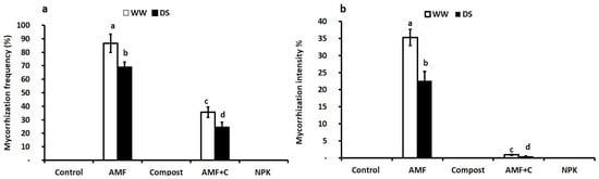 Effects of different water regimes (75% field capacity (WW); open bars and 35% FC; filled bars) on (a) mycorrhization frequency and (b) intensity in control plants (non-amended, non-inoculated), plants inoculated with arbuscular mycorrhizal fungi (AMF) and/or amended with compost (C), and plants treated with conventional chemical fertilizer (NPK). Data are mean ± SE of five biological replicates. Means that share the same letters are not significantly different at p < 0.05 (Tukey’s HSD).