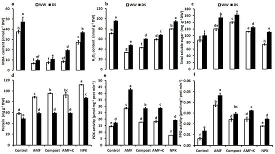 (a) MDA: malondialdehyde content, (b) H2O2: hydrogen peroxide content, (c) total soluble sugar content, (d) protein content, (e) POX: peroxidase activity, and (f) PPO: polyphenol oxidase activity in tomato plants leaves grown under two different water regimes (75% field capacity (FC) shown in open bars, and 35% FC shown in filled bars) and treated (or not; non-amended and non-inoculated control) with either biostimulants (AMF: arbuscular mycorrhizal fungi; C; compost; and combination of AMF + C) or conventional chemical fertilizer (NPK). Means sharing the same letters are not significantly different at p < 0.05, as determined by Tukey’s HSD.