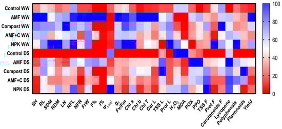 Heat map analyses of tomato plants (leaf and fruit) subjected to different treatments. SH: shoot height; RL: root length; SDM: shoot dry matter; RDM: root dry matter; LN: leaves number, NFL: number of flowers; NFr: number of fruit; FrW: fruit weight; F%: frequency of mycorrhization; I%: intensity of mycorrhization; ΨLeaf: leaf water potential; gs: stomatal conductance; Fv/Fm: chlorophyll fluorescence; Chl a: chlorophyll a; Chl b: chlorophyll b; Car L: carotenoids in leaf; TSS L: total soluble sugar in leaf; Prot L: protein in leaf; H2O2: hydrogen peroxide in leaf; MDA: malondialdehyde in leaf; POX: peroxidase activity in leaf; PPO: polyphenol oxidase activity in leaf; TSS F: total soluble sugar in fruit; Prot F: protein in fruit; Carotenoids; Lycopene; polyphenols; flavonoids; and yield. In the heat map, the color gradient sets bright red as the minimum value, dark blue as the maximum value, and white as mid-range value, with a gradual transition (or gradient) between these endpoints.