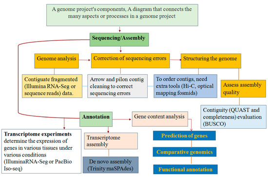 Invasion biology genome projects and elements of a genome project. A flow chart connecting the elements or steps in a genome project.