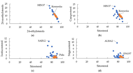The ratios between each individual phytosterol were analysed by mapping scatter plots for all genotypes. As expected, wild accessions had a higher ratio diversity between all phytosterols compared to the B. napus commercial cultivars. Scatter plots for the ratio among the major phytosterols are shown in Figure 1. Some wild accessions exhibited higher phytosterol ratios than the other genotypes. The wild accession HIN37 (H. incana) showed twice as high a ratio for 24-methylsterols (campesterol and 24-methylcholesterol) to 24-ethylsterols (sitosterol, isofucosterol, stigmasterol, sitostanol, and stigmast-7-enol) (Figure 1a) and campesterol to sitosterol (Figure 1b) compared to the B. napus commercial cultivars. The wild accession SAR12 (S. arvensis) had a 7-fold higher isofucosterol to sitosterol ratio (Figure 1c) and ALBA2 (S. alba) had a 6-fold higher stigmasterol to sitosterol ratio (Figure 1d) compared to the average in the B. napus commercial cultivars.
