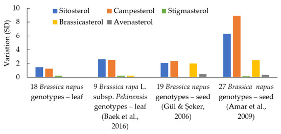 Comparison of the B. napus (leaf samples) phytosterol variation among genotypes with the B. rapa L. subsp. Pekinensis (leaf samples) genotypes and B. napus commercial cultivars (seed samples) grown in field conditions [25,28,29].