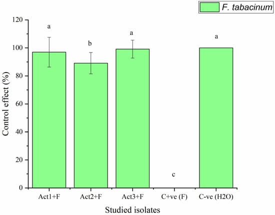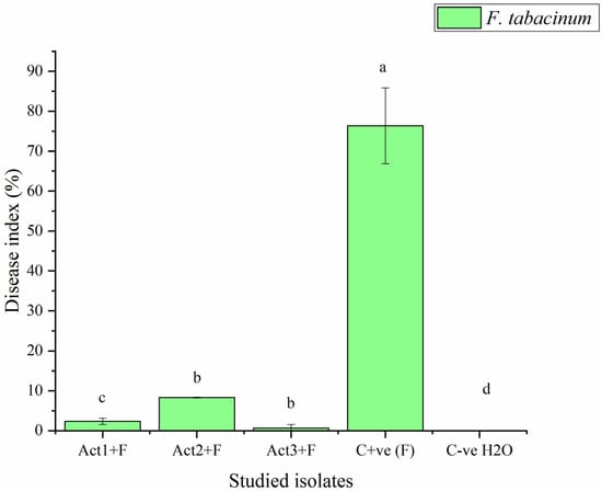 Disease index of basil infected with F. tabacinum. Where: Act1+F; Act2+F; Act3+F are inoculated plants with Streptomyces sp., S. atratus and A. humicola, respectively. Bars with different letters between different treatments are significantly different at p < 0.05 according to Tukey’s B multiple comparison post hoc test using SPSS software. Values are mean of 3 replicates ±SDs.
