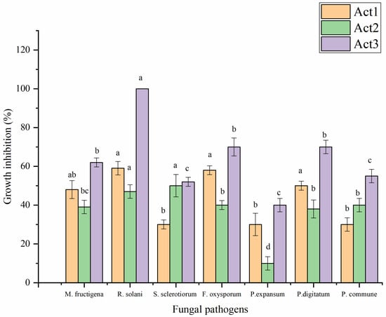 Antifungal activity of extracted metabolites. Bars with different letters between different phytopathogenic fungi for each treatment are significantly different at p < 0.05 according to Tukey’s B multiple comparison post hoc test using SPSS software. Values are mean of 3 replicates ±SDs.