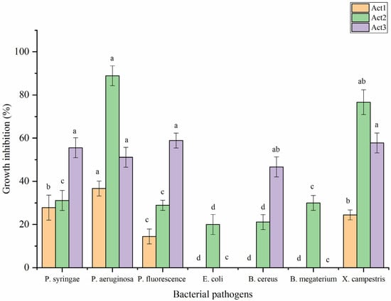 Antibacterial activity of extracted metabolites. Bars with different letters between different phytopathogenic bacteria for each treatment are significantly different at p < 0.05 according to Tukey’s B multiple comparison post hoc test using SPSS software. Values are mean of 3 replicates ±SDs.