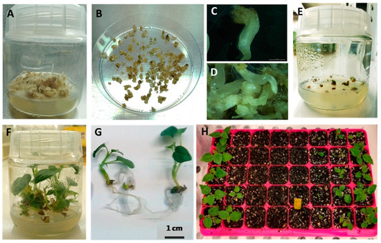 Somatic embryo development and conversion into plantlets. (A)—Calli after four weeks in the development medium showing somatic embryos (flask size is 6 cm × 7 cm); (B)—Embryos in a Petri dish 100 mm × 20 mm; (A)—Morphological aspect of a single somatic embryo after four weeks in the development medium; (D)—Cluster of embryos resulting from line ES after four weeks in the development medium; (E)—Somatic embryos in the conversion medium; (F)—Plantlets resulting from somatic embryos after four weeks in the conversion medium; (G)—Somatic embryogenesis-derived plantlets; (H)—Plantlets during the acclimatization phase.