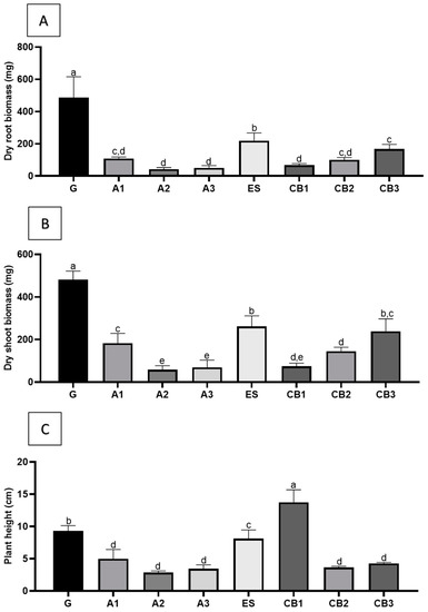 Growth parameters in plants obtained by different propagation methods and seed-derived plants (G), micropropagation-derived plants rooted in vitro (A1), ex vitro (A2), and ex vitro with 0.5 mg·L−1 IBA (A3); organogenesis-derived plants in medium supplemented with 1 mg·L−1 BA (CB1), 2 mg·L−1 BA (CB2), and 3 mg·L−1 BA (CB3) and SE-derived plants from the line ES (ES). (A) Dry root biomass; (B) dry shoot biomass; (C) plant height. Means ± SDs, different letters indicate significant differences between treatments, according to Tukey’s test (p < 0.05).