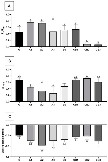 The data resulting from the physiological evaluation of the plants were analyzed by a one-way ANOVA comparing the means of each group, followed by Tukey’s multiple comparison tests (p < 0.05). All the statistical analyses were performed with GraphPad Prism for Windows v. 6.01.
