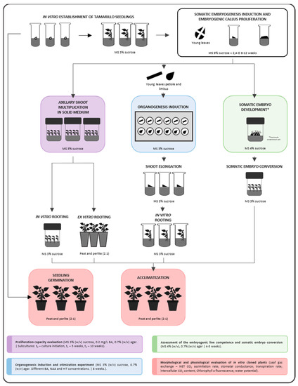 Experimental design followed for the morpho-physiological evaluation of tamarillo plants obtained by different micropropagation techniques. Three propagation methods were tested: axillary shoot multiplication in the solid medium, organogenesis, and somatic embryogenesis. Differences between in vitro and ex vitro rooting and rooting success were assessed for axillary shoot-derived plants. Acclimatization rates were evaluated. Morphological and physiological parameters were measured for plants derived from the three micropropagation methods and for seed-derived plants.