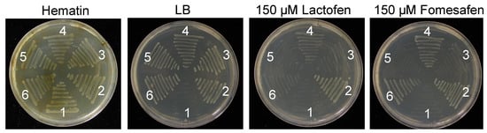 Functional complementation assay in the BT3 HemG E. coli strain. E. coli strains grew on the LB medium or LB medium with supplement of 20 µg mL−1 Hematin, 150 µM Lactofen, and 150 µM fomesafen, respectively. Isolates are as follows: 1, BT3 HemG strain untransformed control; 2, transformed with construct encoding A. palmeri resistant PPX2 protein with ∆G210; 3, transformed with construct encoding A. palmeri susceptible PPX2 protein; 4, transformed with construct encoding A. palmeri PPX2 protein with V361A and R480T substitutions, which is identified in Alabama palmer plant; 5, transformed with construct encoding mutagenized A. palmeri PPX2 protein with R480T substitution; 6, transformed with construct encoding mutagenized A. palmeri PPX2 protein with V361A substitution.