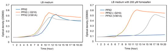 To compare the resistance level of PPX2 with ∆G210 and PPX2 with V361A, a dose–response testing was performed in BT3 hemG mutant strain. At 200 µM fomesafen, BT3 hemG transformed PPX2 did not grow well. Interestingly, BT3 hemG transformed PPX2 with ∆G210 grew much faster than BT3 hemG transformed PPX2 with V361A, suggesting that PPX2 with V361A substitution confers a lower resistance level than PPX2∆G210 (Figure 4).