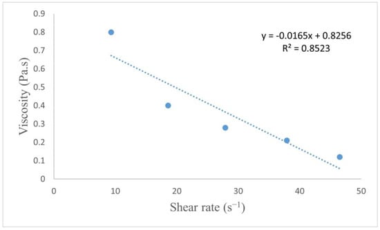 Figure 1 shows the relationship between viscosity and shear rate of TRG solutions. The solutions exhibited non-Newtonian fluid behavior, wherein the viscosity decreased with increasing shear rate. The TRG film had a viscosity of 0.4 Pa.s at room temperature. A previous study reported that the viscosity of 0.4 Pa.s was ideal for use in films [26]. Similar to the previous results by Mohammadifar et al. [27], the TRG film had good water solubility and color properties (Table 1). TRG treatment resulted in a glossy exterior of the fruit without any unwanted darkening or opaque appearance.