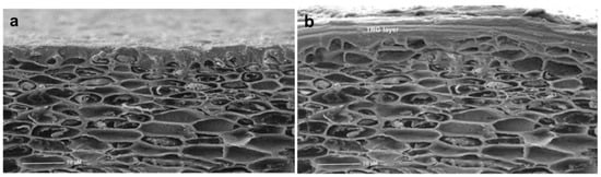 The TRG coating was clearly visible on the mango surface compared with the noncoated surface, as seen in Figure 2a,b. Furthermore, the flatness of the coatings altered in response to changes in the structure of the mango epidermis. This observation suggested that the coating was strongly bonded to the surface and that the coating formation and compactness were excellent. Furthermore, the surface had nearly no holes. This study also validated the coating’s high degree of adhesion to the mango surface, in agreement with Oak et al. [28].