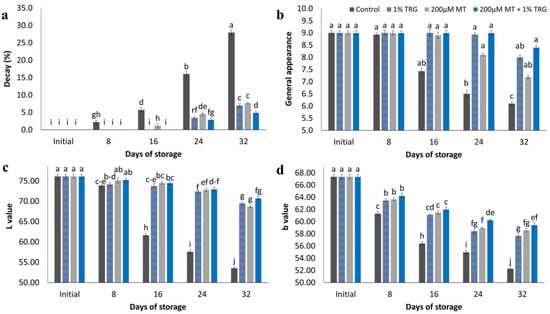Effect of postharvest melatonin (MT) and tragacanth (TRG) treatments on the decay percentage (a), general appearance (b), L value (c), and b value (d) of Keitt mango fruits stored at 12 °C for 32 days. Vertical bars reflect the standard error of the means, with different letters indicating significant variance (p ≤ 0.05) across means, as determined by Duncan’s multiple range test.