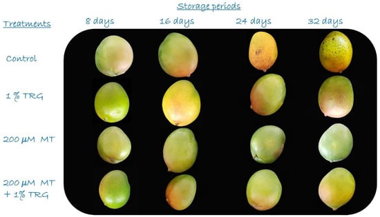 Figure 3b and Figure 4 present the effects of MT and TRG treatments on the general appearance of the fruit. In general, fruit quality decreased sharply after the 32-day storage period in untreated fruits, whereas treated fruits showed better quality scores. All TRG-treated mangoes were significantly more acceptable during the storage period and after the 32-day storage period at 12 °C. Treatment with 200 µM MT + 1% TRG and TRG alone maintained fruit appearance, as indicated by the scores of 8.40 and 8.33, respectively, whereas the control showed the lowest acceptability score at 6.10.