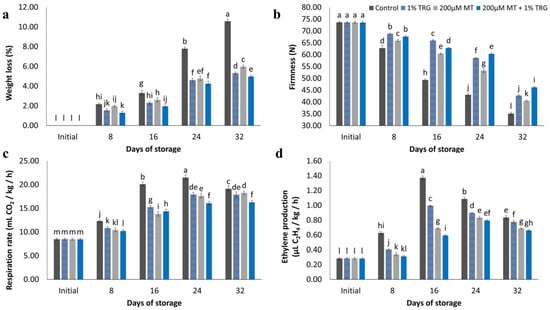 Weight loss increased consistently under all conditions during the 32-day storage period, as shown in Figure 5a. All treated fruits had lower weight loss values than untreated fruits. Control fruits showed approximately 50% higher weight loss than fruits treated with 200 µM MT + 1% TRG. The highest weight loss was detected in untreated fruits (10.57%) after the 32-day storage period at 12 °C, whereas fruits treated with 200 µM MT + 1% TRG and 1% TRG alone showed a weight loss of 4.98% and 5.30%, respectively.