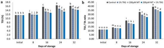 Figure 6a shows the effect of different MT and TRG treatments on TSS content. Fruits treated with 200 µM MT + 1% TRG showed lower TSS contents than control fruits, which showed the highest contents during the cold storage period. A linear increase in TSS content was observed during the storage period at 12 °C. Control fruits showed the highest TSS content (16.17%), whereas fruits treated with 200 µM MT + 1% TRG showed the lowest TSS content (14.23%) at the end of the storage period. A similar trend was observed in TSS/TA ratio, which gradually increased during the storage period (Figure 6b). Control fruits showed the highest TSS/TA ratio (39.37), whereas fruits treated with 200 µM + 1% TRG showed the lowest ratio (33.71%) after the 32-day storage period under experimental conditions.