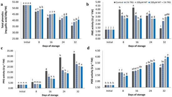 Effect of postharvest melatonin (MT) and tragacanth (TRG) treatments on the total phenolic content (a), pectin methylesterase (PME) activity (b), polyphenol oxidase (PPO) activity (c), and peroxidase (POD) activity (d) of Keitt mango fruits stored at 12 °C for 32 days. Vertical bars reflect the standard error of the means, with different letters indicating significant variance (p ≤ 0.05) across means, as determined by Duncan’s multiple range test.