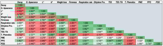 The correlation matrix among various quality attributes of Keitt mango fruits under experimental conditions is shown in Figure 8. Most of the observed values were statistically correlated with each other. Significant correlations were observed among weight loss, respiratory rate, ethylene production, deterioration rate, and PPO, POD, and PME activities. Fruit firmness was significantly negatively correlated with respiration rate, deterioration rate, ethylene production, weight loss, and PPO, POD, and PME activities. Further, it was positively correlated with color, appearance, and total phenolic content. These results are in agreement with those of previous studies [3,4,5,33,35,36].