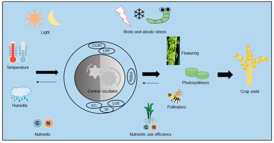Recently, it was found that many staple crops share evolutionarily conserved core oscillator genes with the model plant Arabidopsis [8]. In particular, the homologs of Arabidopsis CCA1 and LHY, along with GIGANTEA (GI), function in both eudicot and monocot plants [8]. Consistently, the circadian clock regulates crop yields on a variety of levels, including plant physiology, biochemistry, development, and metabolic processes. Here, we summarize recent findings about how the circadian clock responds to varying environmental light and temperature cues, as well as abiotic and biotic stresses, to ensure optimal plant growth and reproduction. Based on evidence that the circadian clock affects many agriculturally important traits and enhances their environmental adaptability [2], we propose that a better understanding of the clock will generate strategies to significantly increase crop yields and help us to meet the needs of our growing global population.