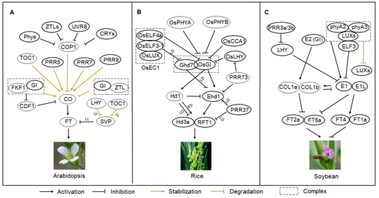 In addition, CCA1/LHY, PRRs, GI, ELF3, and ELF4 were shown to function in photoperiod-dependent flowering regulation in other crops, including soybean, pea (Pisum sativum L.), Broccoli (Brassica oleracea L. var. italica), wheat (Triticum aestivum L.), and maize (Zea mays)(Table 1). However, how light signals and the circadian clock coordinately regulate flowering time in crops remains to be further explored, both biochemically and genetically.