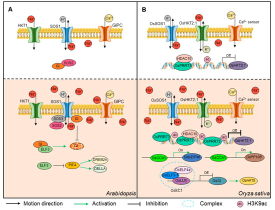 In rice, the components of the circadian clock have also been reported to play significant roles in salt stress responses. OsPRR73, a core component of the circadian clock of rice, confers salt tolerance by interacting with HISTONE DEACETYLASE10 (OsHDAC10) to repress the transcription of HIGH-AFFINITY K+ TRANSPORTERS2;1 (OsHKT2;1), thus regulating cellular Na+ homeostasis [80] (Figure 3B). Another clock component, OsCCA1, functions as a key integrator of salt, osmotic, and drought stresses by regulating the expression of genes in the ABA signaling pathway. Specifically, OsCCA1 binds to the promoters of OsPP2C (PROTEIN PHOSPHATASE 2C) members and OsbZIP46 (BASIC REGION AND LEUCINE ZIPPER 46) to activate their transcription, thus activating a response to salt stress [81] (Figure 3B). In addition, OsEC1, which consists of OsELF4a, OsELF3-1, and OsLUX, also directly binds to the promoter of OsGI to repress its expression. This conveys the stress signaling response by affecting the expression of the downstream ion transporters OsHKT2;1, OsHKT 2;3, OsHKT 2;4, enabling a response to salt stress and regulating the heading date [46] (Figure 3B). As expected, plant circadian clock components regulate salt stress responses at different levels, from transcriptional modification to post-transcriptional modification. Therefore, it will be critical to investigate how plant circadian systems respond to salt stress during different growth stages, with special emphasis on exploring the precise molecular mechanisms through which the crop circadian clock regulates salt stress responses.
