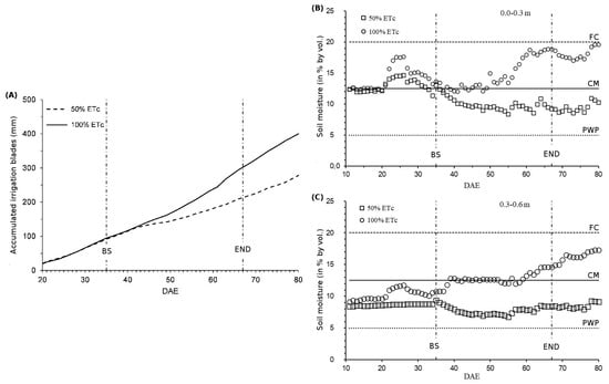 Accumulated irrigation depths (A) and soil moisture content measured during the soybean cycle in response to water regimes (50% and 100% of ETc) applied to 0.0–0.3 m (B) and 0.3–0.6 m (C) soil layers. DAE = days after emergence. FC = field capacity. CM = critical moisture. PWP = permanent wilting point. BS = beginning of stress (differentiating between WRs at 35 DAE). END = end of the application of the differentiated irrigation depths (67 DAE).