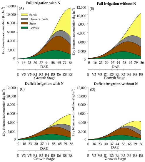 Total dry biomass of soybean plants under full irrigation with N (A), full irrigation without N (B), deficit irrigation with N (C), and deficit irrigation without N (D).