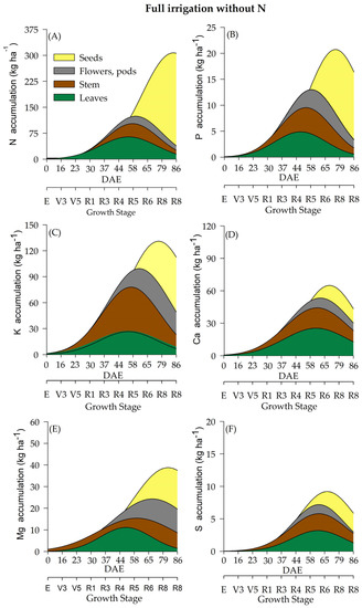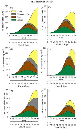 Total accumulation of macronutrients [nitrogen-N (A), phosphate-P (B), potassium-K (C), calcium-Ca (D), magnesium-Mg (E) and sulfur-S (F)] under a full water regime and N fertilization throughout the soybean cycle.