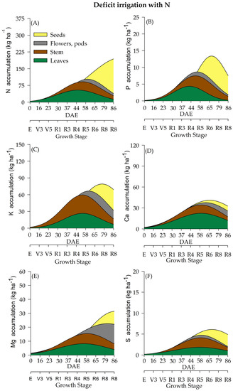 Total accumulation of macronutrients [nitrogen-N (A), phosphate-P (B), potassium-K (C), calcium-Ca (D), magnesium-Mg (E) and sulfur-S (F)] under a deficient water regime and with N fertilization throughout the soybean cycle.
