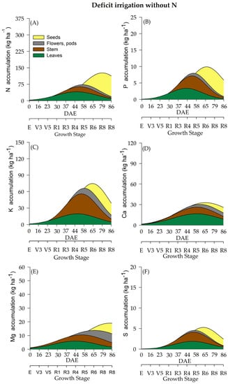Total accumulation of macronutrients [nitrogen-N (A), phosphate-P (B), potassium-K (C), calcium-Ca (D), magnesium-Mg (E) and sulfur-S (F)] under a deficient water regime and without N fertilization throughout the soybean cycle.