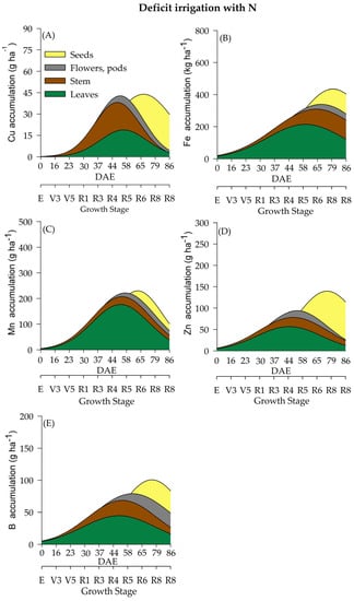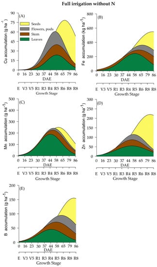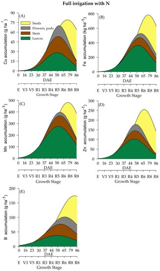 The lowest values of Zn accumulation were recorded only in soybean plants under deficient WR without N fertilization. Under full WR, the maximum Zn accumulation was found to be 245 g ha−1 (stage R7; 60 DAE) and 216 g ha−1 (stage R8; 84 DAE) in plants under full WR with and without N supplementation, respectively, while under deficient WR, maximum Zn accumulation values of 131 g ha−1 (stage R7; 75 DAE) and 85 g ha−1 (stage R5; 57 DAE) were recorded in plants with and without N fertilization, respectively (Figure 9D and Figure 10D).