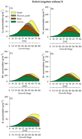 In the current study, water regime (WR) and N fertilization had a significant effect on the accumulation of micronutrients (Cu, Fe, Mn, Zn, and B) (Table 2 and Figure 7, Figure 8, Figure 9 and Figure 10) throughout the soybean cycle. Cu was the least accumulated nutrient by soybeans throughout the cycle for all treatments, while Fe was the most accumulated micronutrient. Overall, soybean plants under deficient WR showed lower values of Cu accumulation, especially when plants received N fertilization. The maximum accumulation of Cu occurred at R7 (70 and 76 DAE) under full WR, with and without N fertilization (77 and 79 g of Cu ha−1, respectively) (Figure 7A and Figure 8A). Conversely, the maximum accumulation of Cu in the deficient WR (30 g ha−1 and 45 g ha−1, with and without N fertilization, respectively) occurred between R5 and R7 (60 and 71 DAE). The HIs for Cu under full WR were 0.73 and 0.75 with and without N fertilization, respectively. In the deficient WRs, the HIs for Cu were 0.59 and 0.60 with and without N supplementation, respectively.