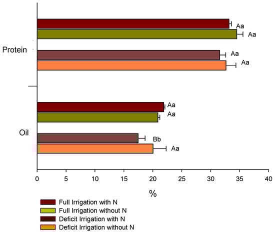 Protein and oil content in soybean seeds from different water regimes and nitrogen (N) treatments. Similar lowercase letters denote no significant difference concerning nitrogen fertilization (with N × without N), whereas similar uppercase letters denote significant differences.