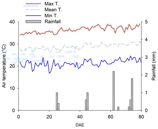 Maximum (Max T), minimum (Min T), and average air temperatures (Mean T) and rainfall during the experiment. DAE—days after emergence.