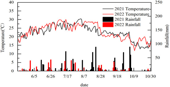 This research was performed in Dayan Town, Jiangyou City, Sichuan Province, China, between May and October of 2021 and 2022 (37°71′ N, 104°80′ E; annual average temperature: 16.2 °C; annual average sunshine: 1367 h; annual average rainfall: 1100 mm). The experimental field was a winter fallow cropland. The surface soil (0–20 cm depth) at the study site contained 1.87 g kg−1 total N [18] (Kjeldahl method, UDK-169, ITA), 26.98 mg kg−1 available phosphorus (Mo-Sb colorimetry following H2SO4 and HClO4 digestion), 2.51% organic matter (K2Cr2O7-volumetric method), and 58.16 mg kg−1 available K (flame spectrometry following NH4OAc extraction). The soil pH was 6.69, as measured in a sample with a 1:2.5 soil:water ratio. Average air temperature and precipitation data from the previous rice-growing season (Figure 1) were collected from a weather station close to the experimental site.