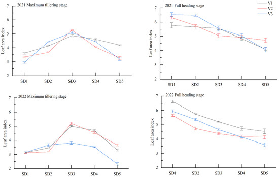 The leaf area index of growth-constrained direct-seeding rice at the maximum tillering and full heading stages is shown in Figure 2. The leaf area index at the maximum tillering stage increased and then decreased as the sowing date was delayed (Figure 2). With SD3 treatment, the leaf area index differed notably among varieties. The leaf area index of V2 was higher than that of V1 and V3. At the full heading stage, the leaf area index decreased, with the highest index obtained with the SD1 treatment. The leaf area index of the SD2, SD3, SD4, and SD5 treatments was compared with that of the SD1 treatment, with increases of 0.61–13.42%, 3.64–22.48%, 16.29–30.13%, and 25.04–39.39%, respectively. The full heading stage for V1 was 5.92% and 2.74% higher for V2 and V3, respectively.