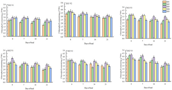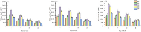 The chlorophyll content of the tested varieties was the highest 0 days after full heading for each treatment (Figure 3). The chlorophyll content of the flag leaf decreased as growth progressed. The chlorophyll content of the flag leaf was highest with the SD3 treatment across all sowing dates. The chlorophyll content of flag leaf in SD1, SD2, SD4, and SD5 treatments was 11.50–2.29%, 10.86–26.55%, 4.79–6.92%, and 6.54–23.14%, respectively, highest than in the SD3 treatment at 21 days after full heading. This showed that delayed sowing resulted in delayed chloroplast degradation and improved the capacity for photosynthetic material production. At 0 days after full heading, the chlorophyll content of V2 in SD1 was 26.32% higher than that of V1 and 0.60% higher than that of V3. The chlorophyll content of V3 in SD2, SD3, SD4, and SD5 treatments was 40.21%, 19.58%, 23.83%, and 18.02%, respectively, higher than that of V1, and 11.30%, 11.63%, 10.81%, and 5.70%, respectively, higher than that of V2. Figure 3 shows that at 0 days of the full heading, the peroxidase activity of the tested varieties was the highest for each treatment and showed a decrease as growth proceeded. The peroxidase activity of the tested varieties was highest with the SD3 treatment among the different sowing dates. The peroxidase activities of the tested varieties were 36.17–57.58%, 21.21–25.00%, 0–21.21%, and 7.50–36.36% higher with the SD1, SD2, SD4, and SD5 treatments, respectively, compared to that with the SD3 treatment 21 days after full heading. By delaying the increase in peroxidase activity at the sowing date, the senescence of rice leaves could be delayed, thus maintaining a higher photosynthetic function of the leaves. The peroxidase activity of V2 seedlings in SD1 was 80.00% higher than that of V1 and 12.50% higher than that of V3 seedlings 0 days after full heading. The peroxidase activities of V3 in SD2, SD3, SD4, and SD5 were 14.93%, 34.26%, 83.10%, and 50.00% higher than those of V1, and 16.67%, 12.40%, 31.31%, and 20.83% higher than those of V2 for the same treatments.