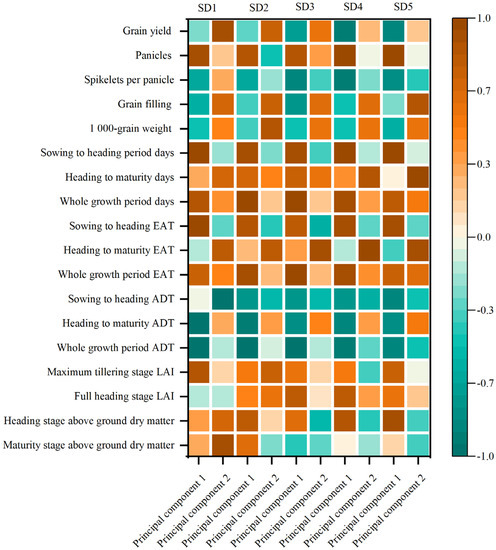 Effects of sowing date on principal component load matrix of rice from 2021 to 2022. EAT, effective accumulated temperature; ADT, average daily temperature; LAI, Leaf area index, SD1, 16 May; SD2, 23 May; SD3, 30 May; SD4, 6 June; SD5, 13 June.