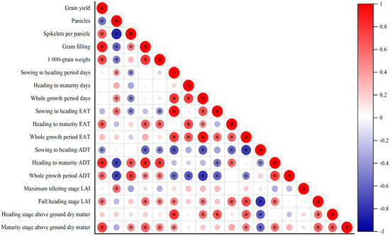 Correlation of rice growth parameters under different sowing dates. EAT, effective accumulated temperature; ADT, average daily temperature; LAI, Leaf area index,* significances at p < 0.05, respectively.