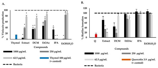 - Ćirić, A.D.; Petrović, J.D.; Glamočlija, J.M.; Smiljković, M.S.; Nikolić, M.M.; Stojković, D.S.; Soković, M.D. Natural products as biofilm formation antagonists and regulators of quorum sensing functions: A comprehensive review update and future trends. S. Afr. J. Bot. 2019, 120, 65–80. [Google Scholar] [CrossRef]