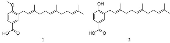 - López, S.N.; Lopes, A.A.; Batista, J.M.; Flausino, O.; da Bolzani, V.S.; Kato, M.J.; Furlan, M. Geranylation of benzoic acid derivatives by enzymatic extracts from Piper crassinervium (Piperaceae). Bioresour. Technol. 2010, 101, 4251–4260. [Google Scholar] [CrossRef] [PubMed]