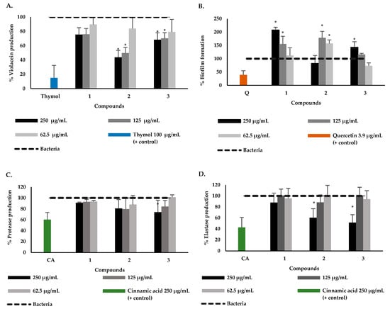 2.2. Effect of P. bogotense Compounds against C. violaceum Quorum Sensing, Biofilm Formation and Production of Virulence Factors in P. aeruginosa