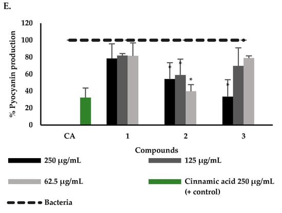 - Ugurlu, A.; Karahasan Yagci, A.; Ulusoy, S.; Aksu, B.; Bosgelmez-Tinaz, G. Phenolic compounds affect production of pyocyanin, swarming motility and biofilm formation of Pseudomonas aeruginosa. Asian Pac. J. Trop. Biomed. 2016, 8, 698–701. [Google Scholar] [CrossRef]