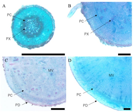 Histological observation of the vascular bundle in root system of ‘Purple Sweet Lard’. (A) 15 days after transplant DAT, (B) 30 DAT, (C) 45 DAT, (D) 60 DAT. PC: primary cambium, PX: protoxylem, MV: meristem cells around the vessel, PD: periderm, bar = 1 mm.