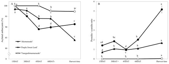 Changes in the percentages of acylated anthocyanin and peonidin/cyanidin ratios during the growth of the root system were investigated (Figure 3). The percentages of acylated anthocyanins in all cultivars were highest at 15 DAT among all growth stages: 98.5% for ‘Akemurasaki’, 100% for ‘Purple Sweet Lord’, and 100% for ‘Tanegashimamurasaki’. As growth continued, the percentages decreased mildly but remained high (Figure 3A). On the other hand, the peonidin/cyanidin ratios in all cultivars were significantly higher at harvest time among all growth stages (Figure 3B).